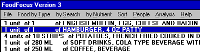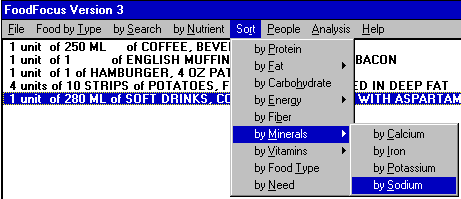 Lesson 1 described the Do, Learn, Improve, Record cycle for which FoodFocus was designed. The Do (choose foods), Learn (review nutrient analysis results) and the Record (using files and printing) activities are relatively straightforward. The Improve phase requires more understanding and judgement. Lesson 8 described how to make changes by changing food quantities and deleting foods. This lesson helps you identify the changes that will be most effective to meet goals. Sorting can be a powerful tool to help develop nutritional understanding and judgement. When you select Sort from the main menu line, several options are presented.